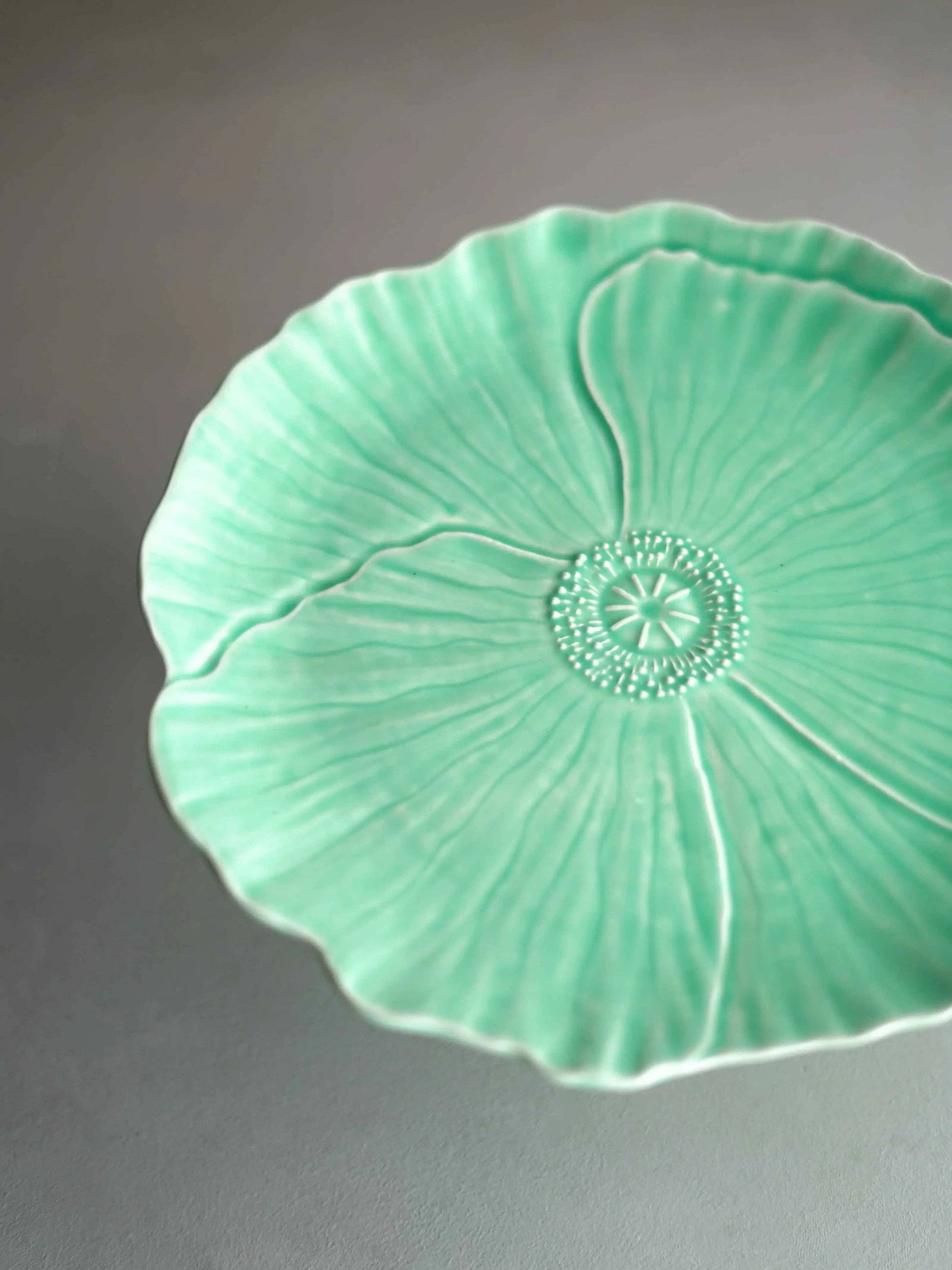 Handmade earthenware cake stand in a beautiful water green colour, with a delicate flower pattern.
