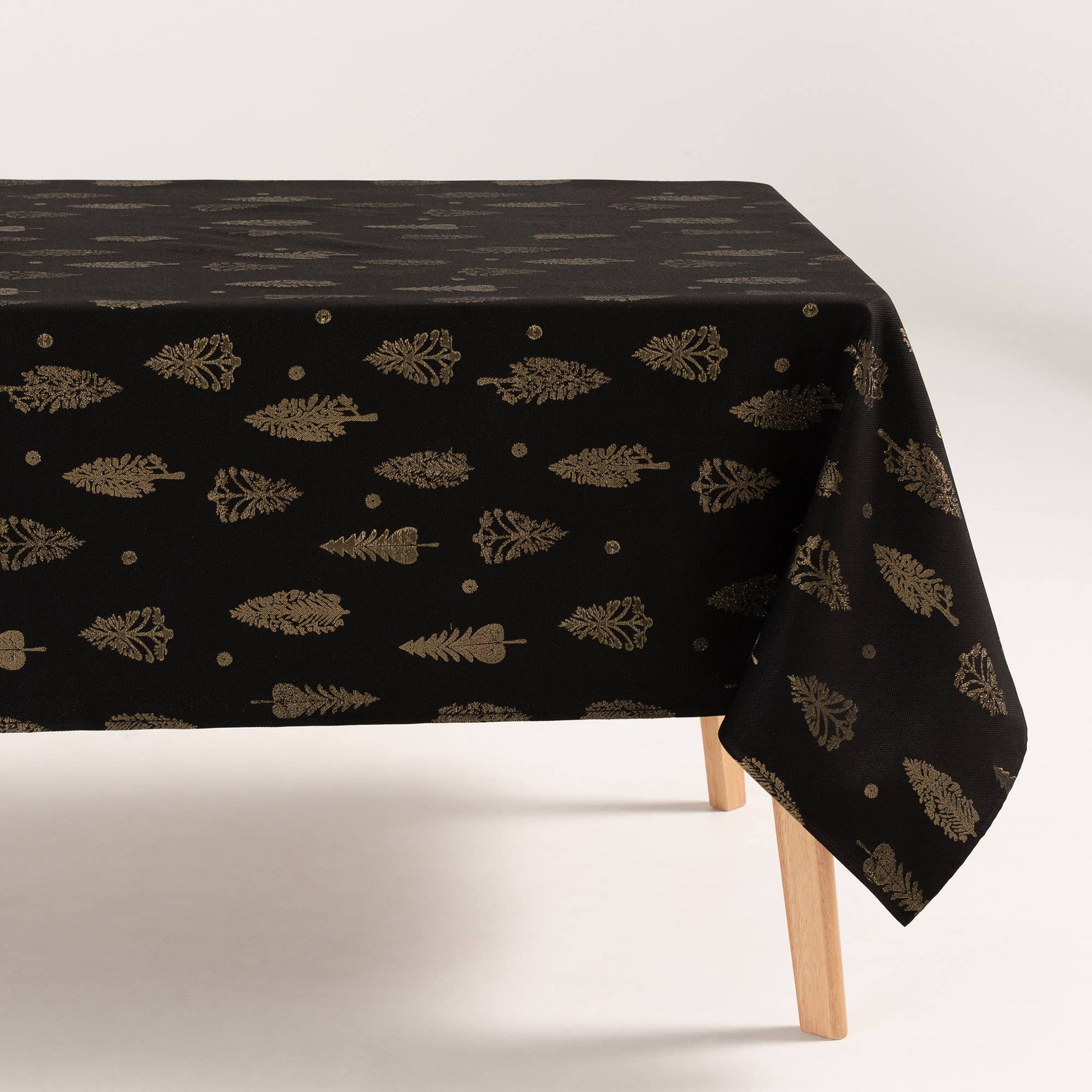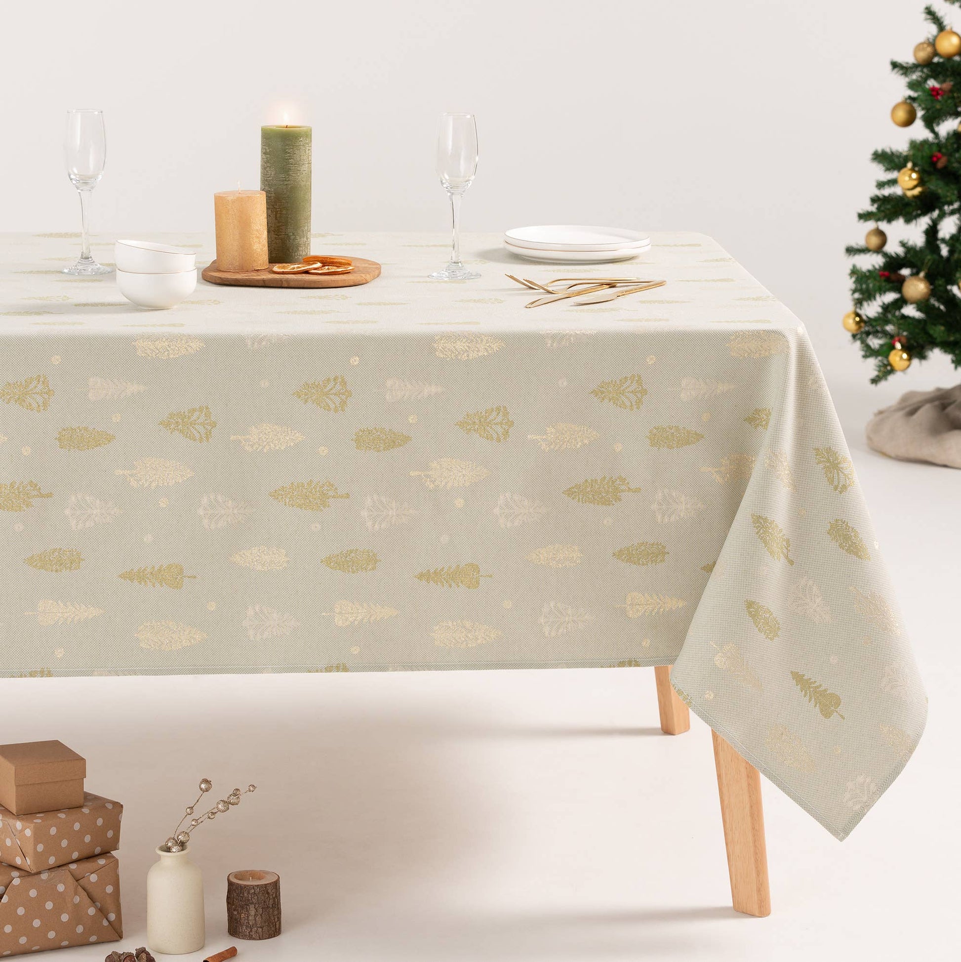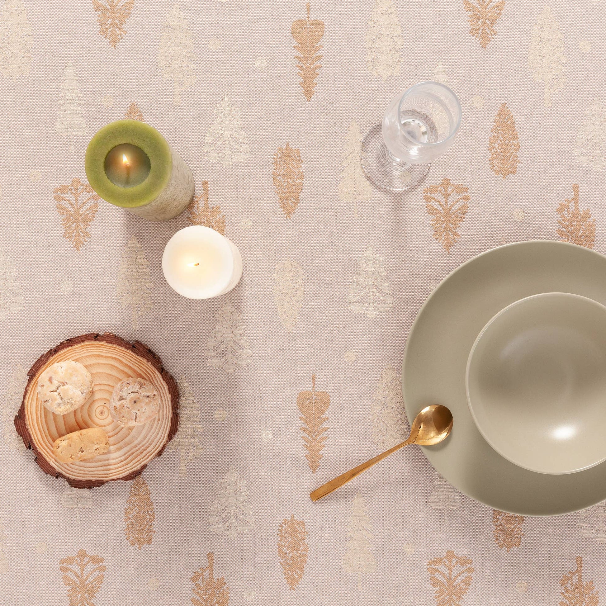 On a warm neutral base, delicate golden motifs of fir trees, pinecones and winter foliage are scattered across the cloth. Fine Lurex threads are woven through the design, catching the light like tiny stars and giving a subtle, elegant shimmer rather than a loud sparkle.