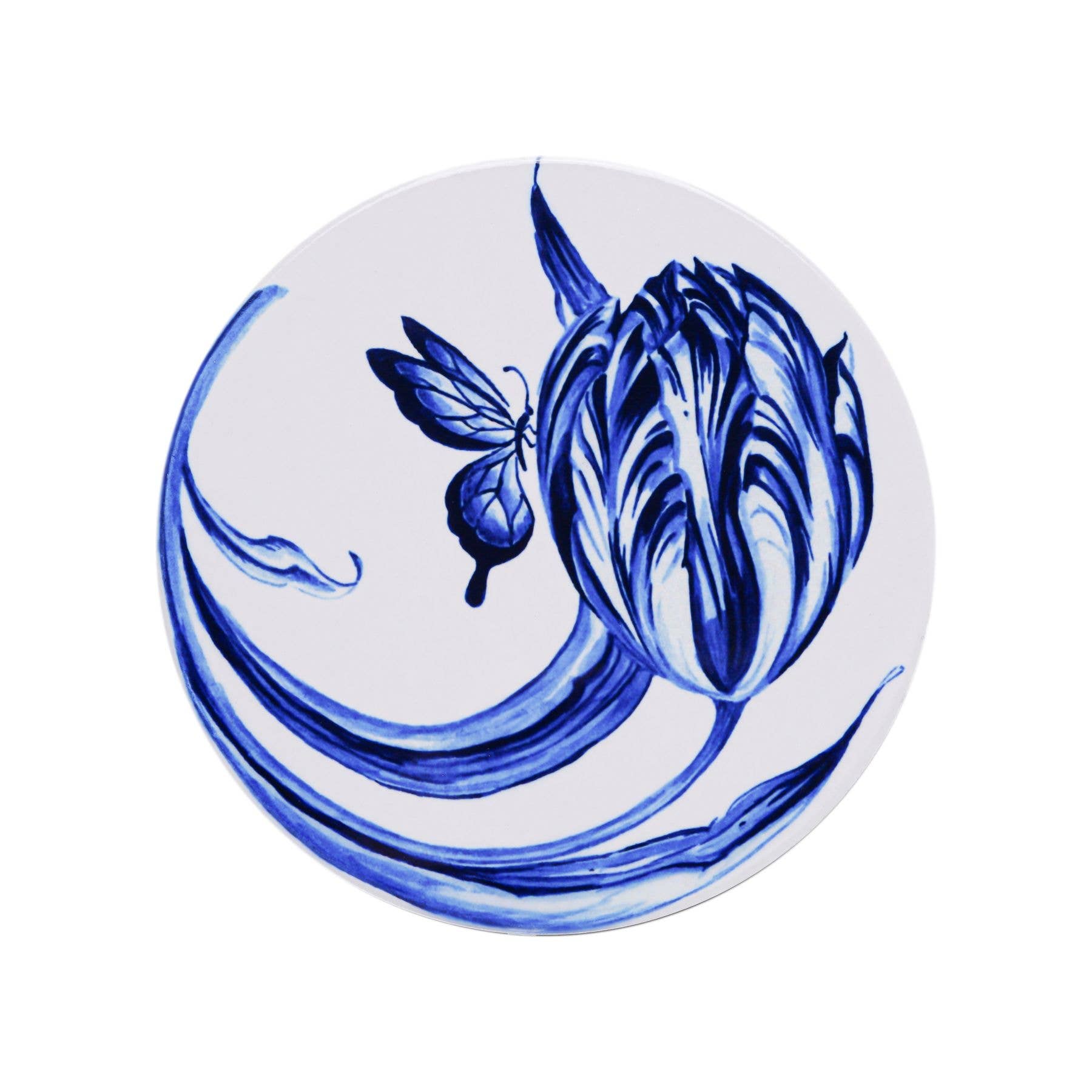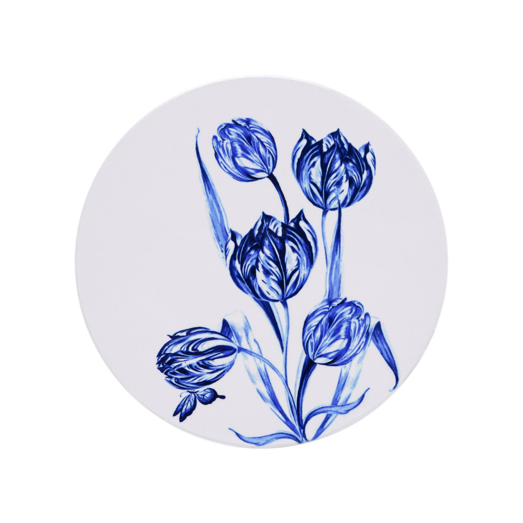 A set of four different coasters for glasses and mugs. The coasters are made of ceramic and have a layer of cork on the bottom to safely place them on the table or countertop. The coasters are decorated with lush Delft blue tulips.