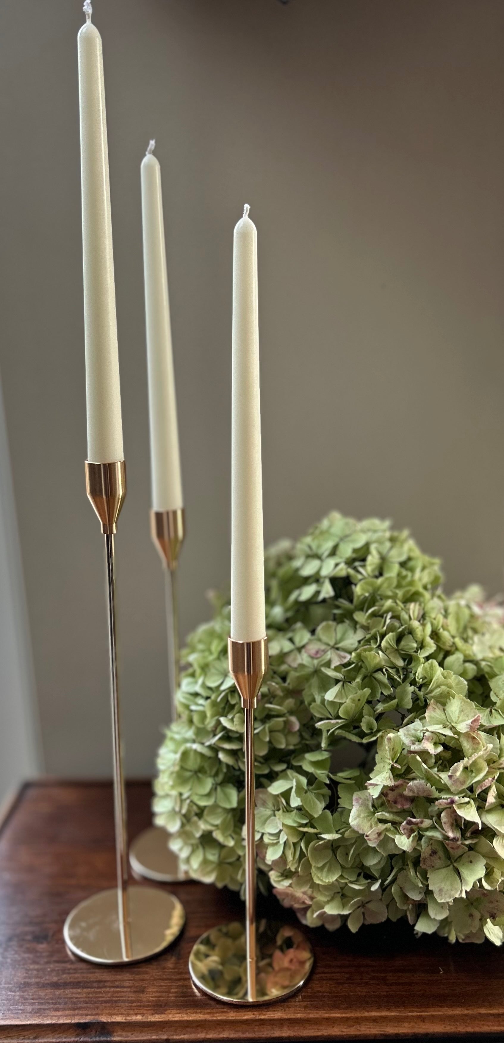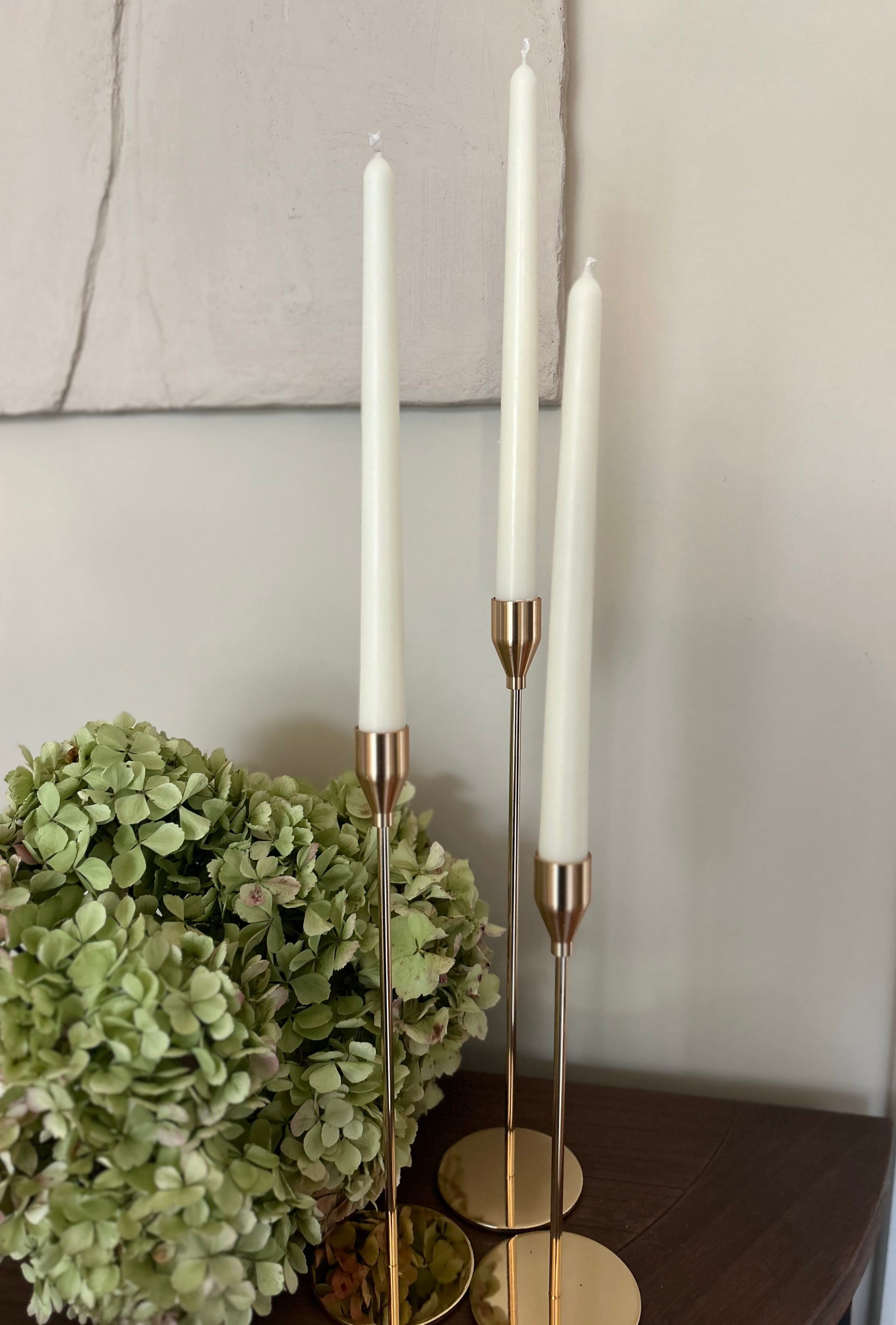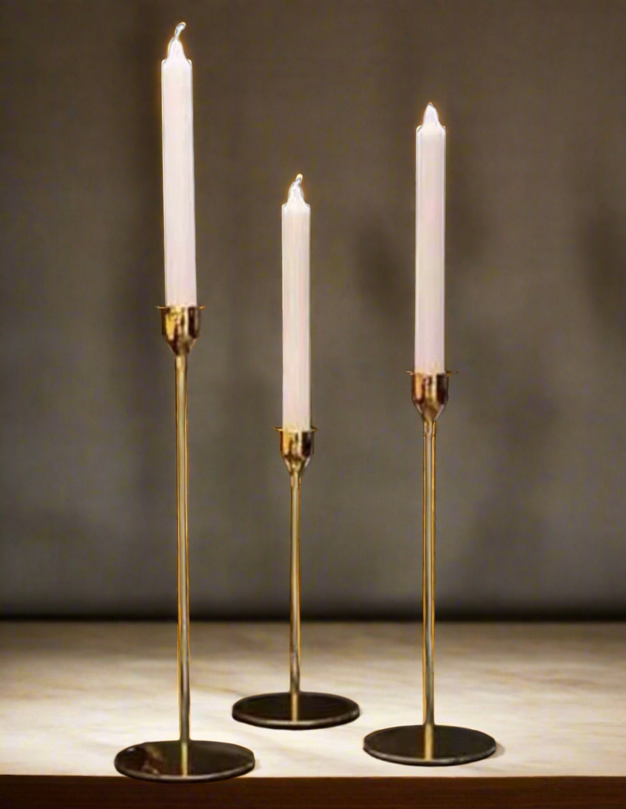 Enhance your home décor with this elegant set of three gold-coloured candle holders, each paired with a sleek taper candle. The holders feature a timeless, minimalist design, crafted with a smooth metallic finish that adds a touch of sophistication to any setting. Perfect for creating a warm, inviting ambiance. The set includes three taper candles, making it ideal for table centerpieces, mantel displays, or special occasions. Whether used for a dinner party or a relaxing evening, this trio offers both functionality and style, illuminating your space with a golden glow.