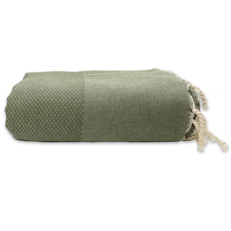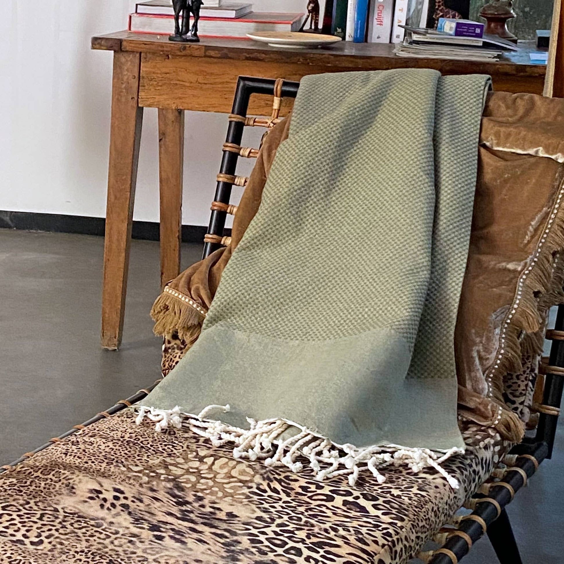 Beautiful, olive green throw, woven in a waffle structure. Finished with fringes on both sides.