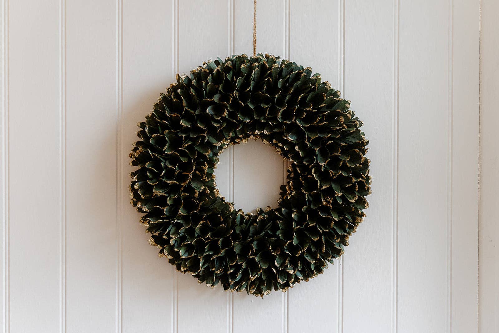 A handcrafted wooden wreath, in a deep festive green colour with just a touch of subtle glimmer.