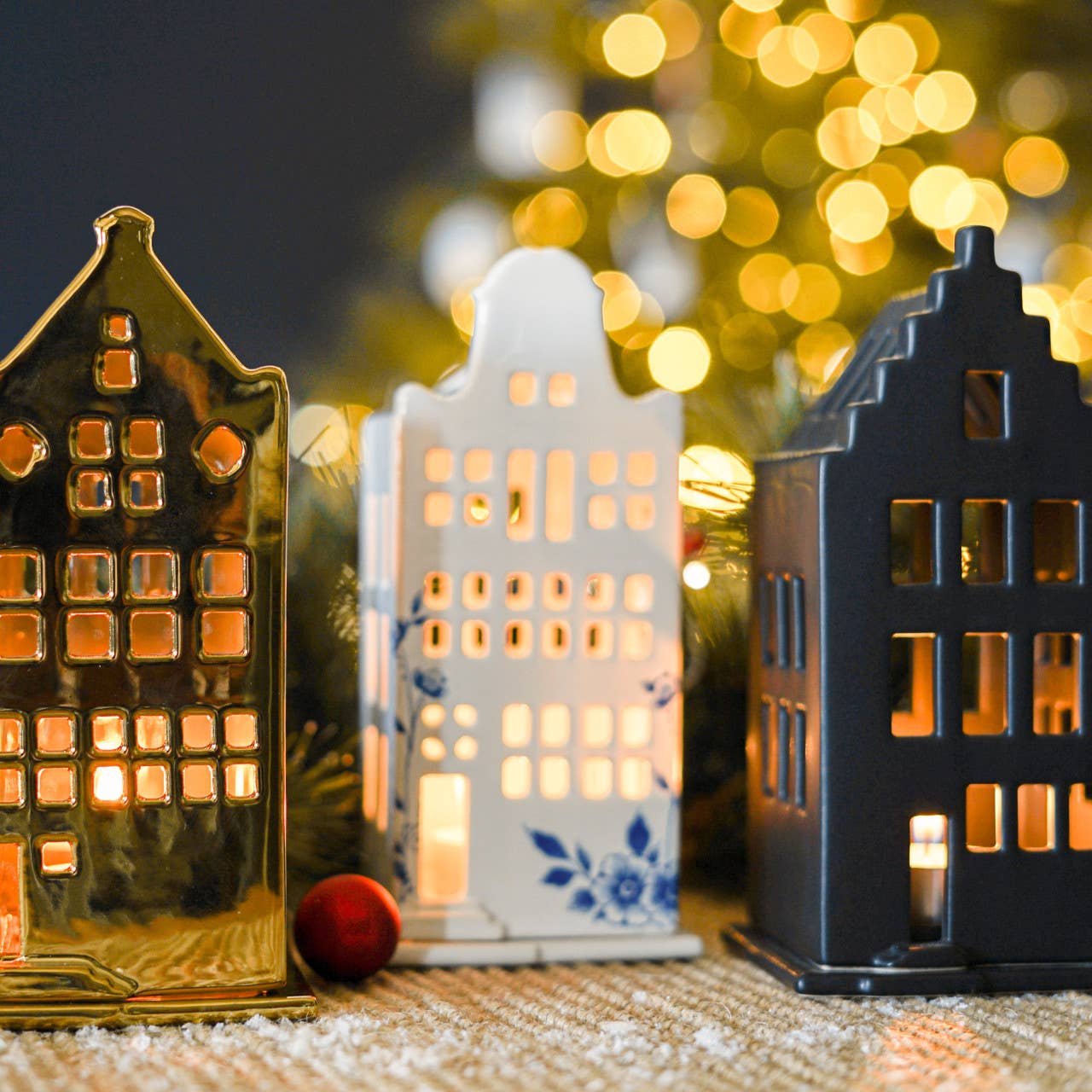 Cosy tea light holder in the shape of a characteristic canal house. This cottage has a stepped gable and is white with an elegant Delft blue decoration.