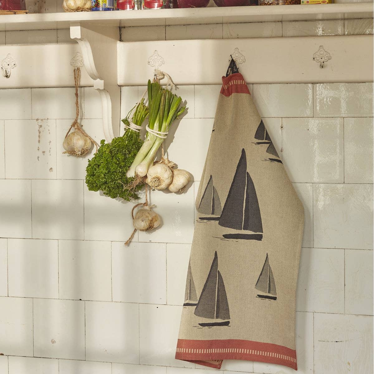 Beautiful tea towel on a natural background, with black sailboat print and a red border.