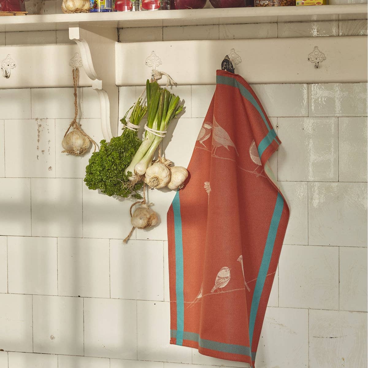 Beautiful tea towel on a burnt orange background, with bird print and a blue border.