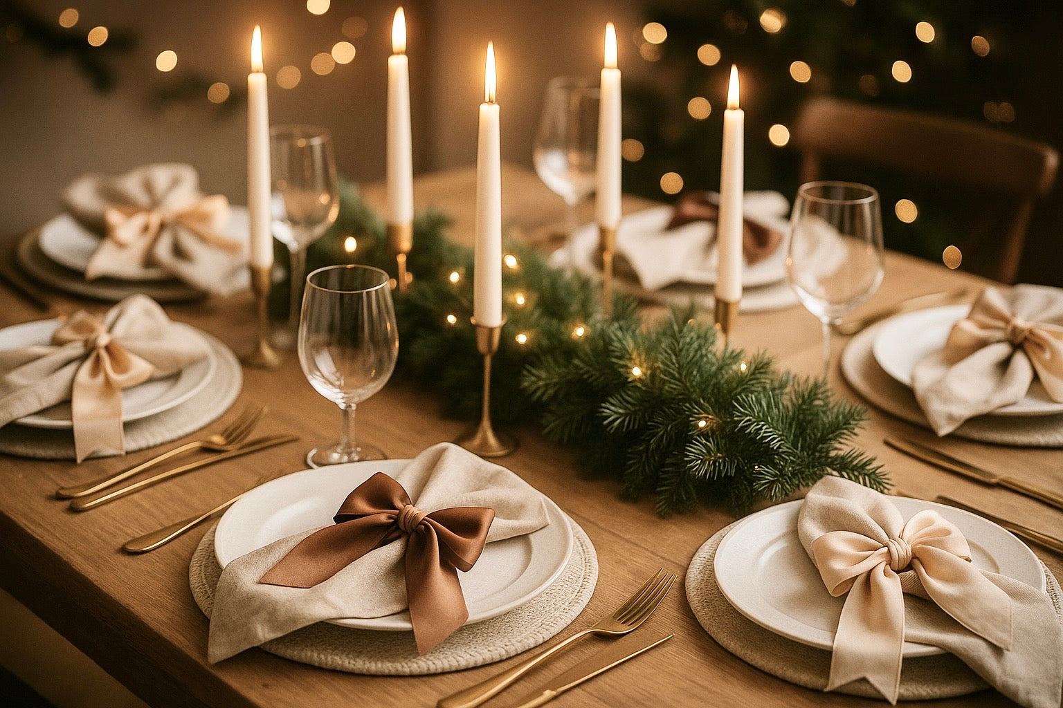 The generous bow sits neatly on top of the napkin, adding volume and texture without overwhelming your place setting – perfect for everything from Christmas Eve supper to New Year’s drinks and nibbles.